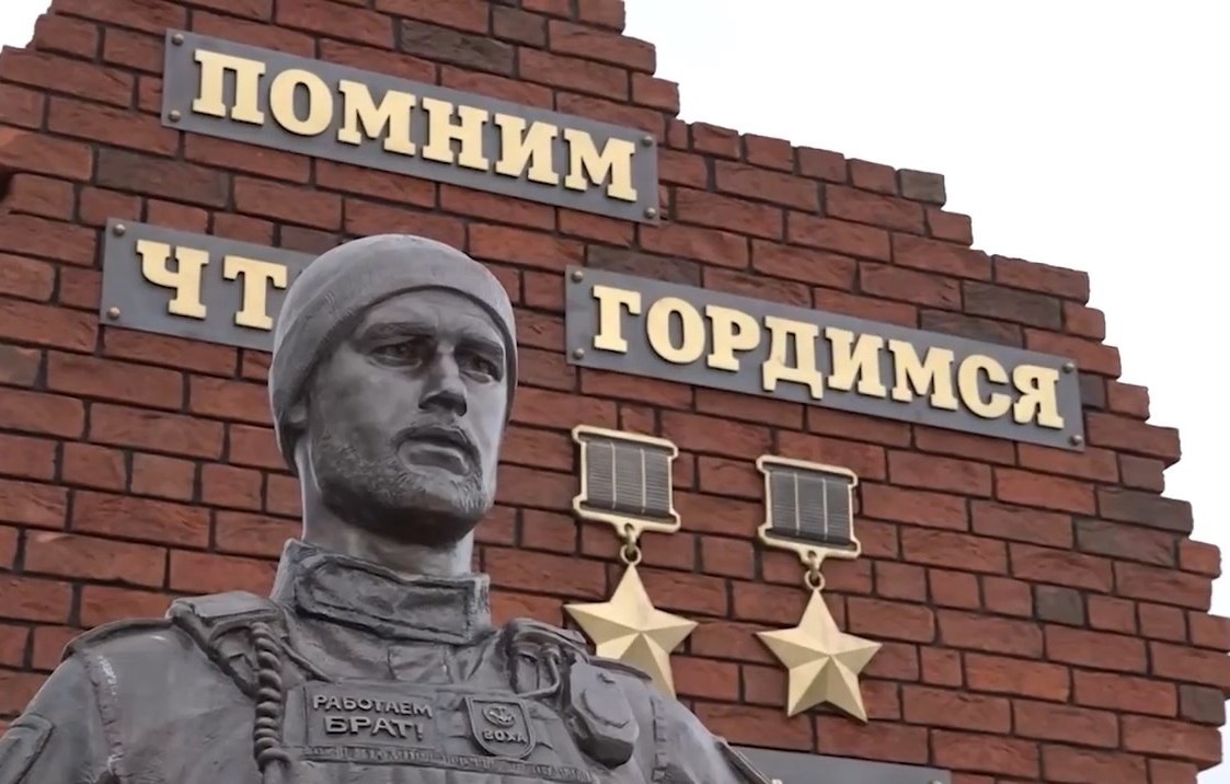 На стене надпись: "Помним. Гордимся. Чтим", две медали Героя России и Героя ДНР, а также описание подвига.Вот как раз пример плохого владения русским языком. Сколько же медалей всего, если "две медали Героя России" да ещё медаль "героя ДНР"?