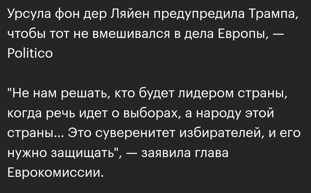 Председатель Еврокомиссии (ЕК) Урсула фон дер Ляйен заявила, что президент США Дональд Трамп не должен вмешиваться в демократические процессы стран Евросоюза (ЕС).
