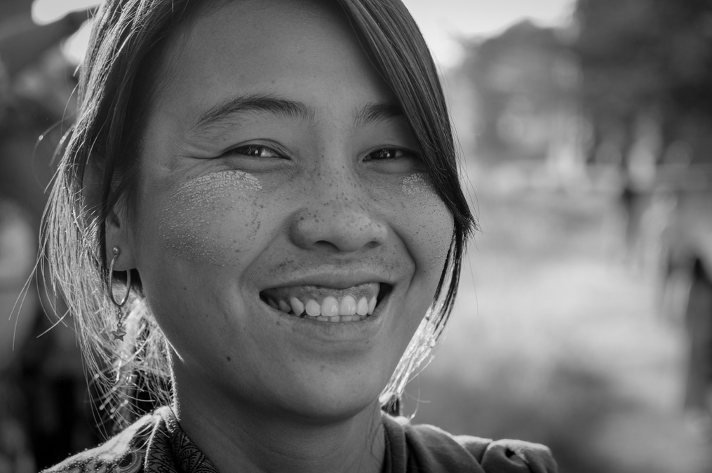 С вставными зубами, с прыщом на носу.