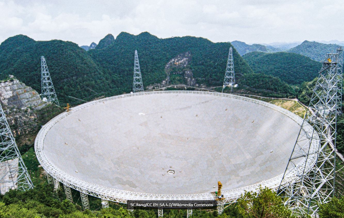 Радиотелескоп FAST расположен в естественной глубокой и круглой карстовой впадине в провинции Гуйчжоу на юго-западе КНР. Он имеет зону приема, равную 30 футбольным полям.