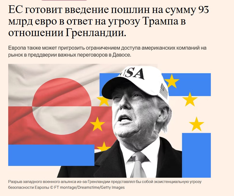 Заявления президента Соединенных Штатов Дональда Трампа о возможном присоединении Гренландии к США, а также введение пошлины в 10% против европейских государств, стали «красной линией» для ЕС.