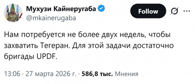 На захват Тегерана у нас уйдёт не больше двух недель, — начальник Вооружённых сил Уганды.