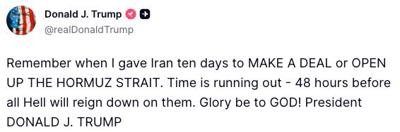 Помните, как я дал Ирану десять дней, чтобы заключить сделку или открыть Ормузский пролив? Время на исходе — осталось 48 часов, прежде чем на них обрушится настоящий ад.
