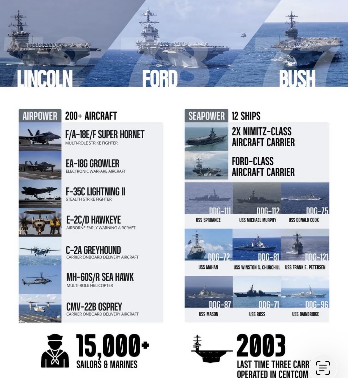 Сразу три авианосные группы ВМС США находятся в районе Ближнего Востока в ожидании команды от Трампа. Речь идет об авианосцах USS Abraham Lincoln (CVN 72), USS Gerald R. Ford (CVN 78) и USS George H.W. Bush (CVN 77), несущих в общей сложности более 200 самолетов. Кроме того, не стоит забывать про сопровождение каждого авианосца, включающего в себя по три эсминца или корвета с управляемым ракетным вооружением.